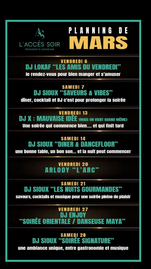 À L’Accès Soir, la soirée ne se résume pas à un dîner. Selon le programme, le restaurant se transforme en lieu d’ambiance : soirées à thème, musique, DJ, moments plus animés…
