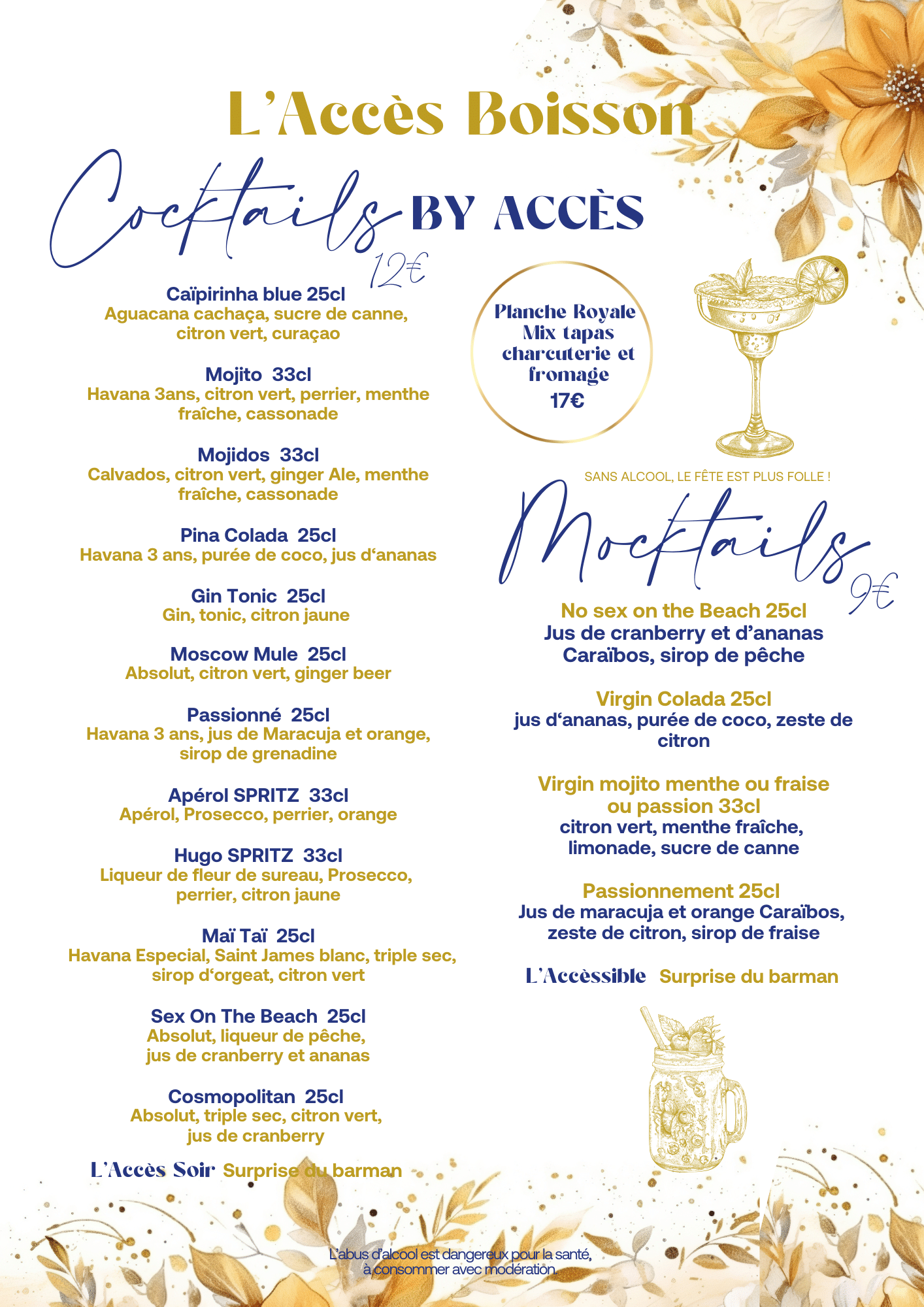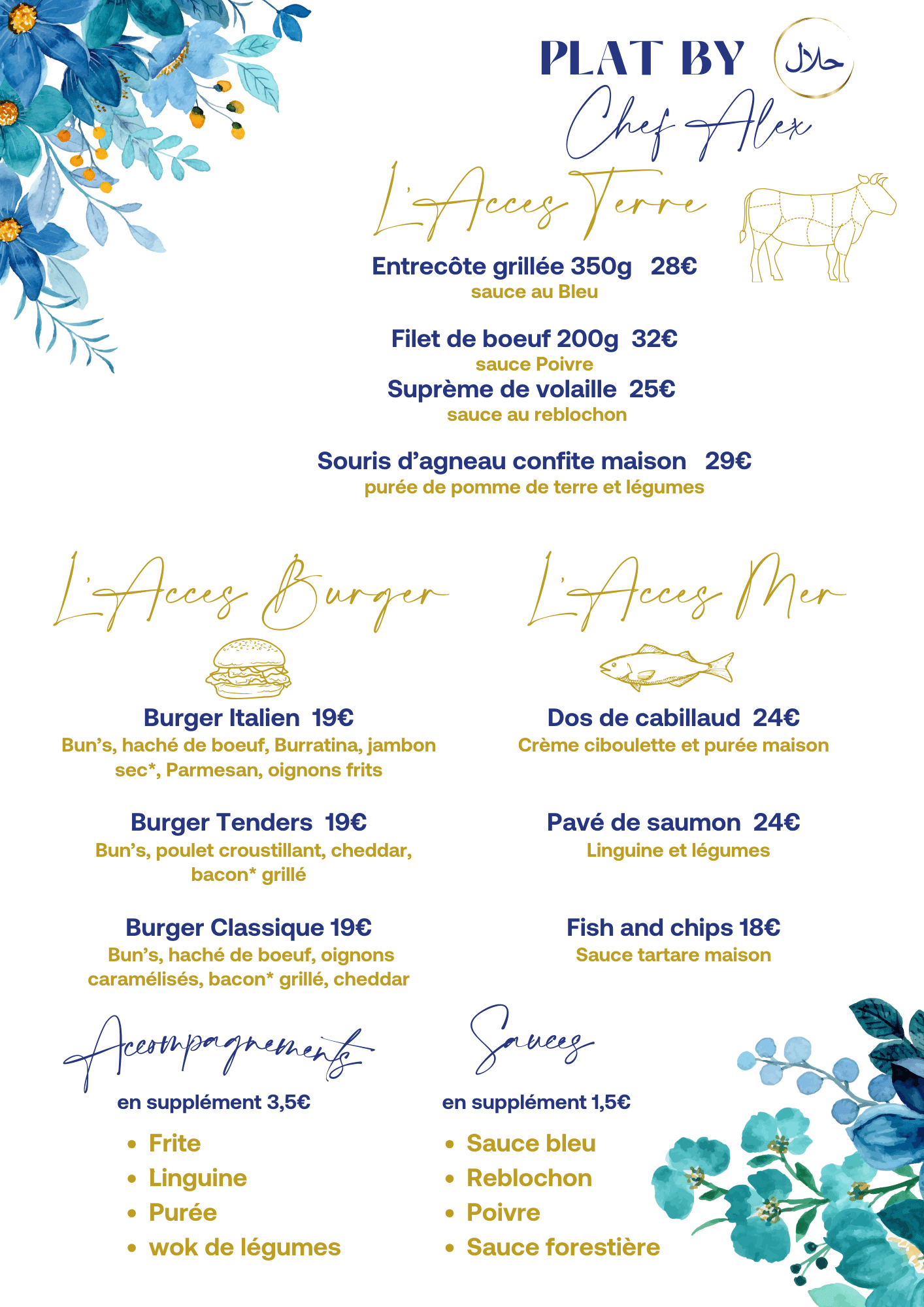 Chez L’Accès Soir, chaque assiette est une invitation au voyage. Des entrées raffinées aux grillades halal, des burgers généreux aux desserts maison, notre menu s’adapte à toutes les envies – qu’on vienne pour un brunch, un dîner en amoureux ou une soirée entre amis.
